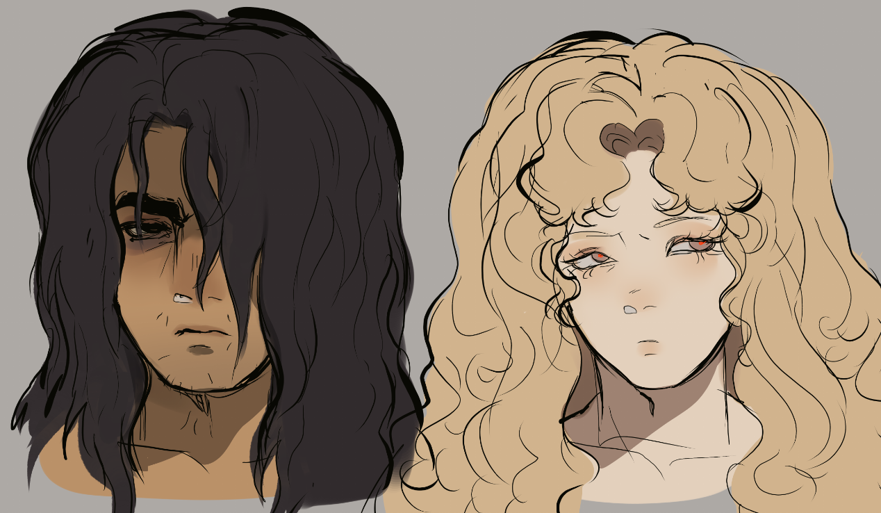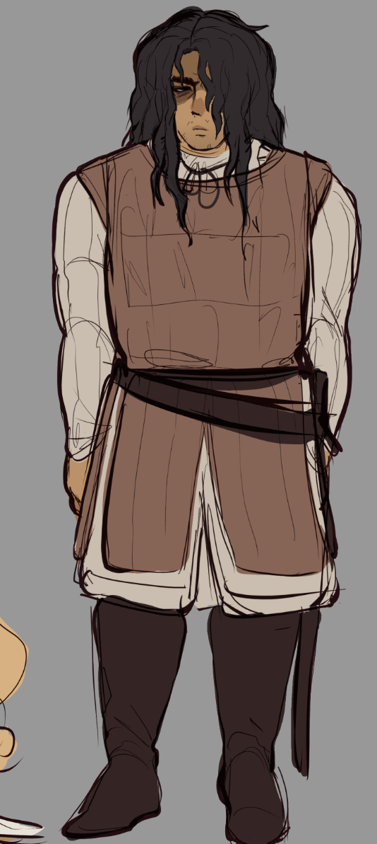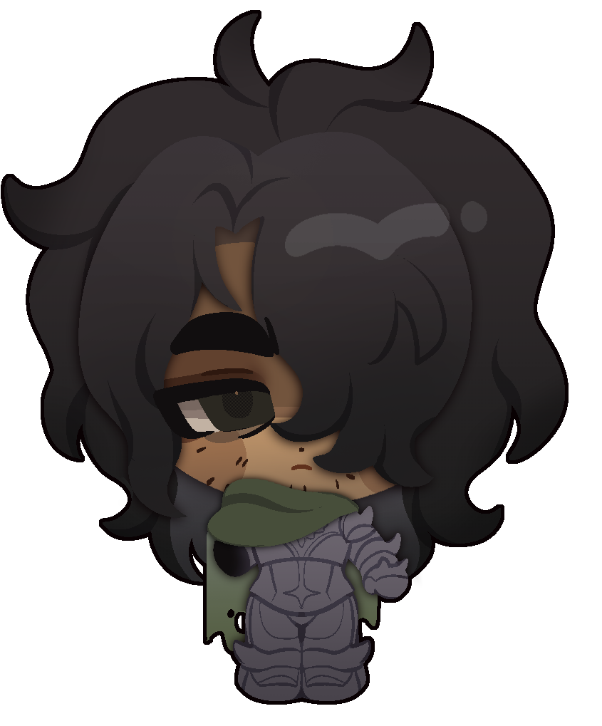 His age has formed him well, a tall and big silhouette that carries his ragged appearance with strength. The armor he wears varies, but a big, green-colored and ripped cloak, gifted by his sister, is something the knight can't let go of. The hood often covers his head, shadows casting over his long raven hair and a sharp, piercing gaze. His face is tanned, barely maintained stubble covering his chin and jaw. His only eye that is visible, the other covered by his bangs, is a dull green. Besides his cloak, the sword that he found in a clearing near his village never leaves him either. The blade has become rather worn out, dulled in color with the lord's flower blossoming around it. Yet still, it cuts deep.