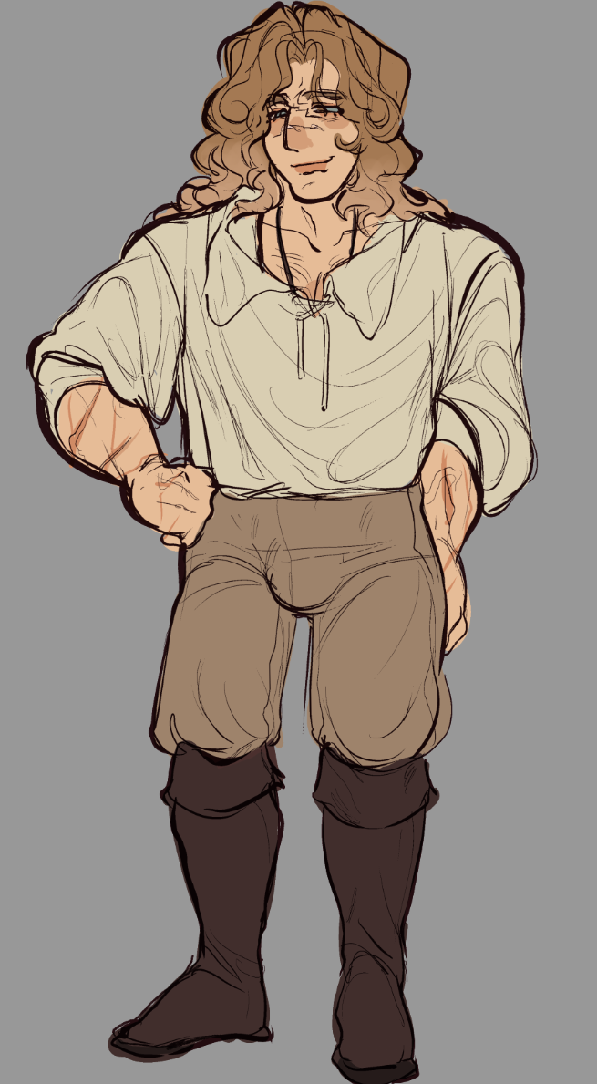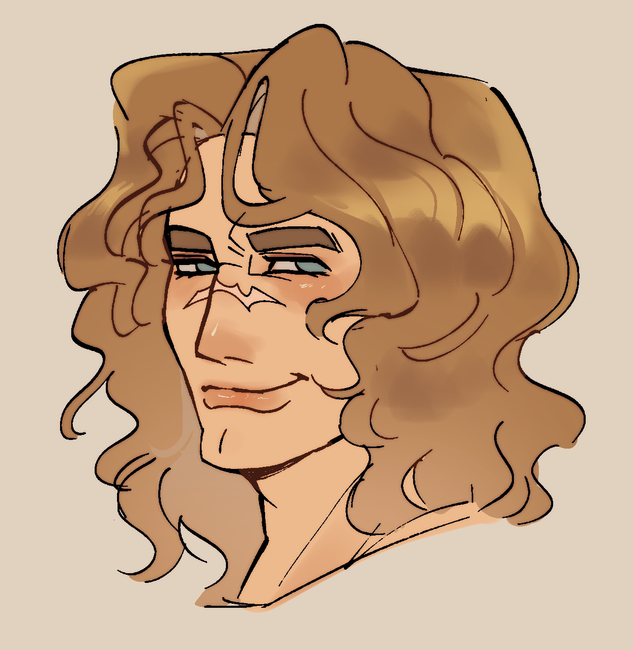 The perfect captain does not disappoint; his appearance is likened to those of a Greek marble statue. The shining, sleek metal armor with countless symbols that represent the local church hides a beautiful, flawless fit physique that many only dream of having. Graceful, and with very few scars, a horizontal one only visible on the bridge of his nose, giving his beauty a certain edge, a threat to those thinking they could best him. Above his ocean blue eyes and luxuriously long lashes are thick, masculine eyebrows that are the same color as his honey-like colored hair, which reaches slightly over his shoulders. His brows are slightly furrowed from years of intense work, shaping him into the stunning man he is now.